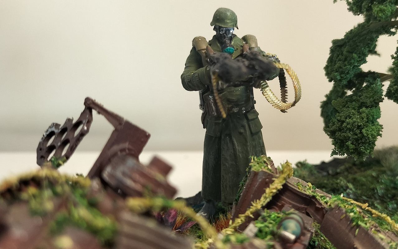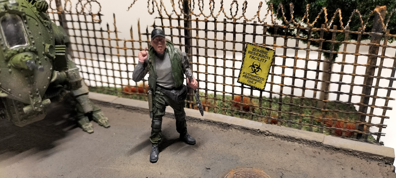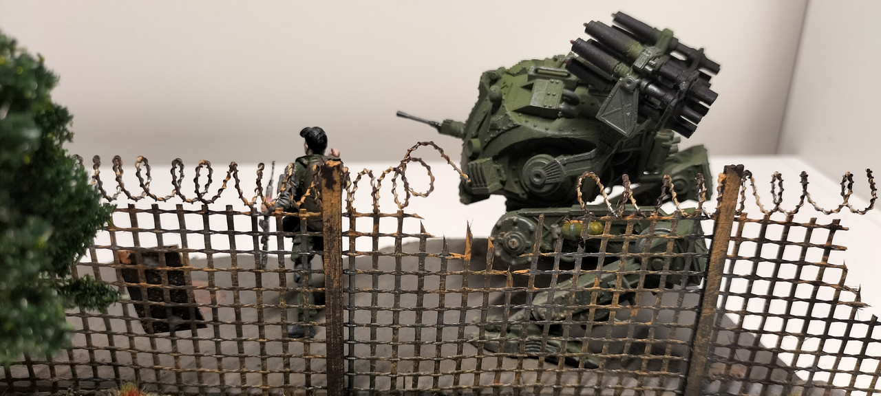 Od materijala za izradu ove vinjete koristil sam stirodur,šahtove od firme Gero-design,figura i model made in china(AliExpress),drvo i posip trave(Javis),tufts (GamersGrass),bodljikava žica(Green Stuff World),ograda je od mrežice za termo fasadu.