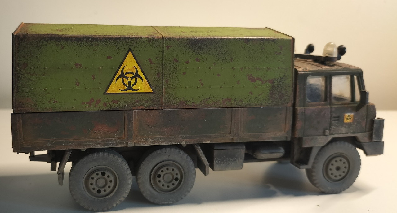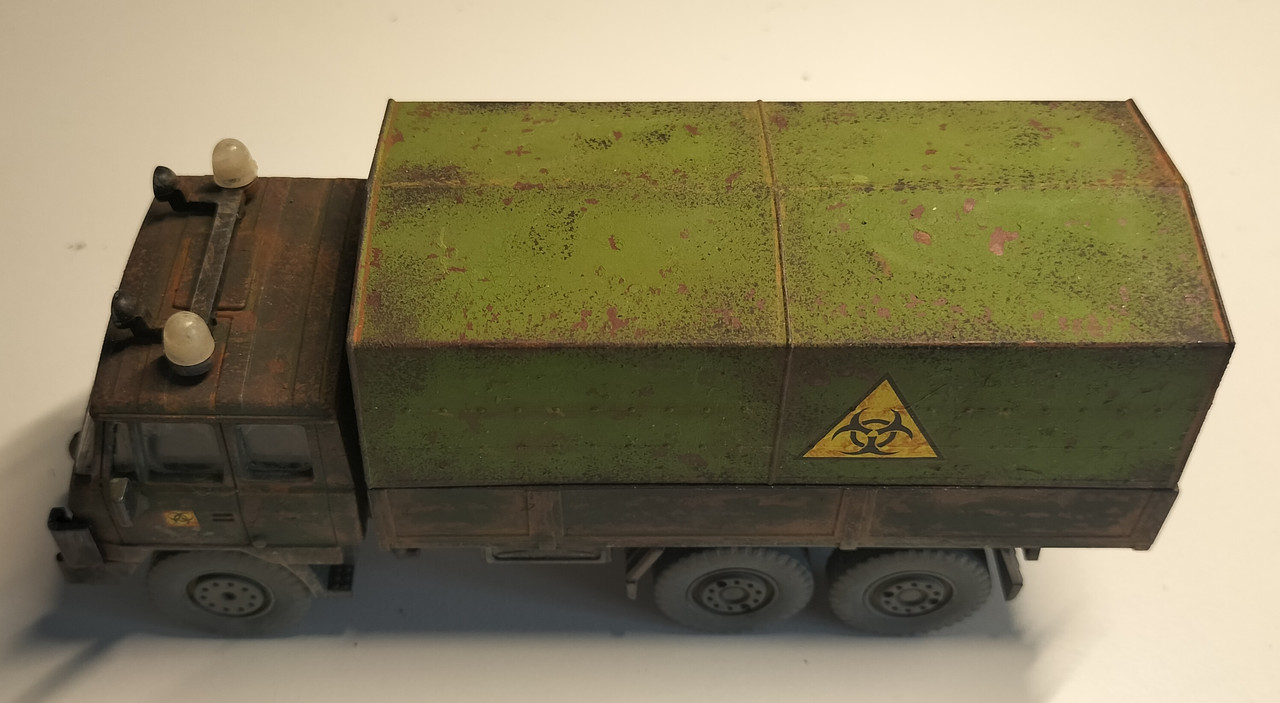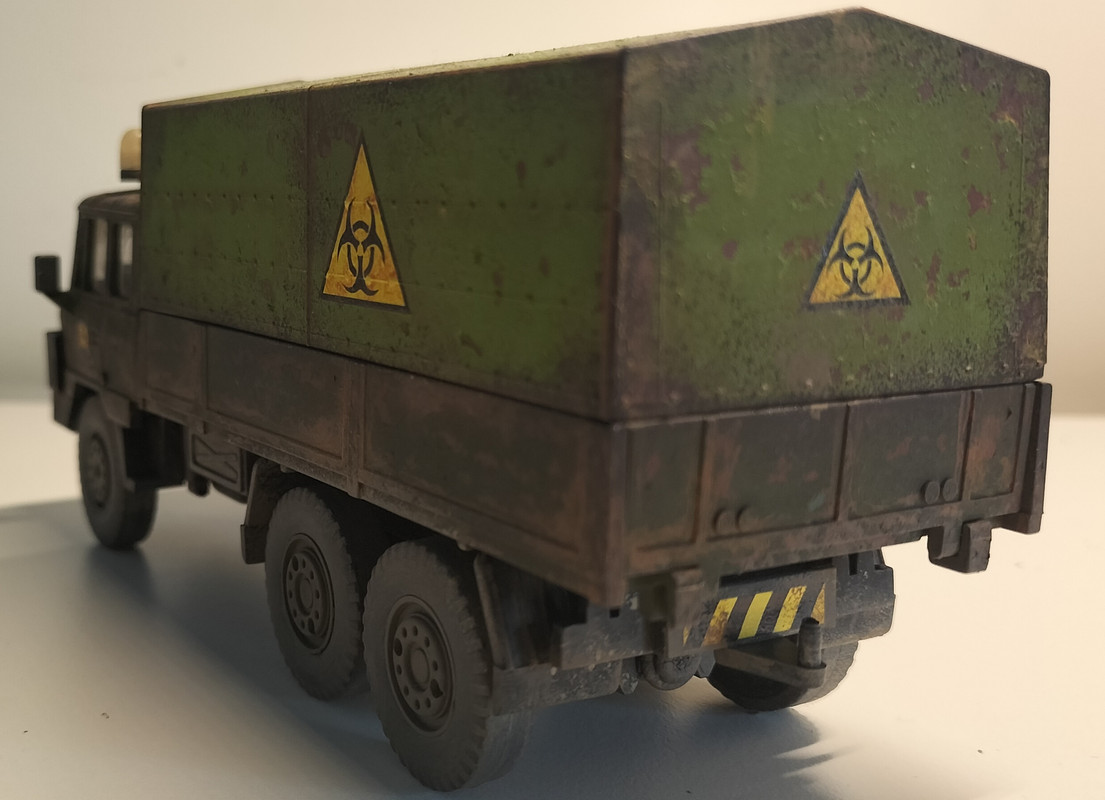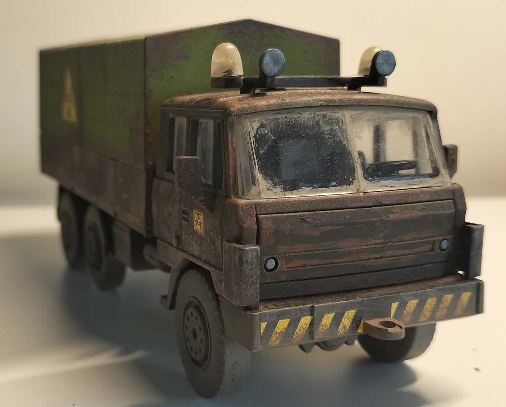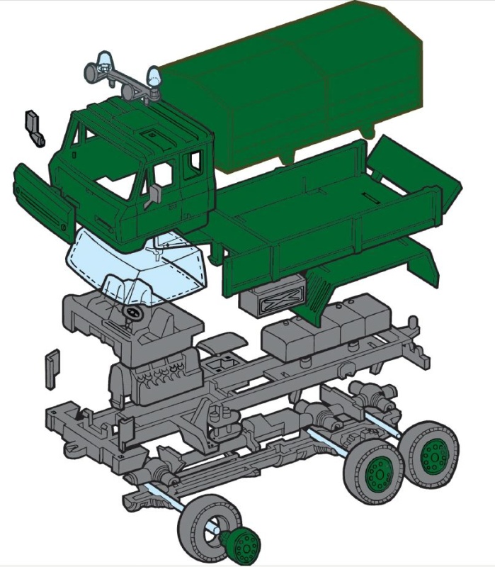 Sam model ima kojih 40-tak dijelova i slaže se po sistemu klik-klak (ko Zvezdini modeli) i moram priznat da se dijelovi lijepo uklapaju.Jedino kaj mi se stvarno nije dopadalo da su gume šuplje sa unutarnje strane pak sam to ispunil kitom i dekali tj.dobe se prave naljepnice koje stvarno nisam upotrebil i umjesto njih sam koristil decale od firme "Green Stuff World".Dijelovi se dobe u već gotovim bojama pa nije potrebno ih farbati pa sam ja odlučil ipak sve to skup prefarbati da na nekaj to liči,dok cerada em kaj ne sliči na ceradu em kaj ne zgleda na ceradu ostavil sam ju i prefarbal ko da je od metala.