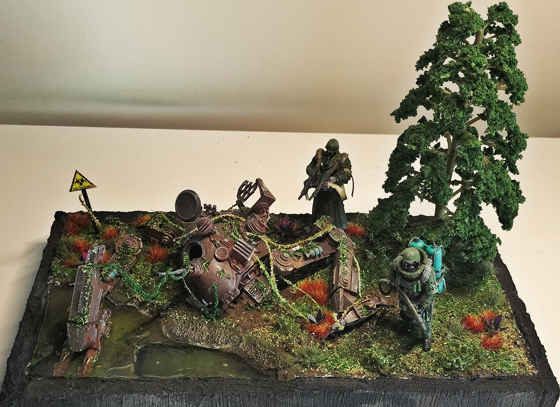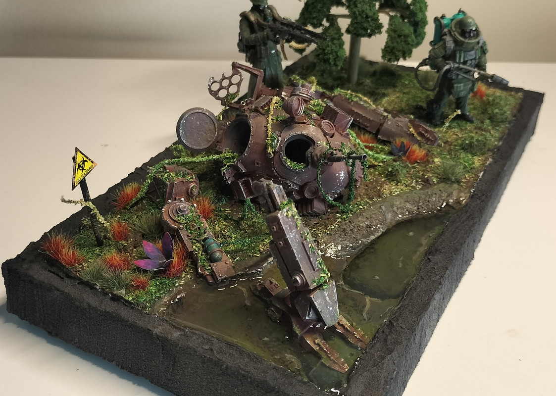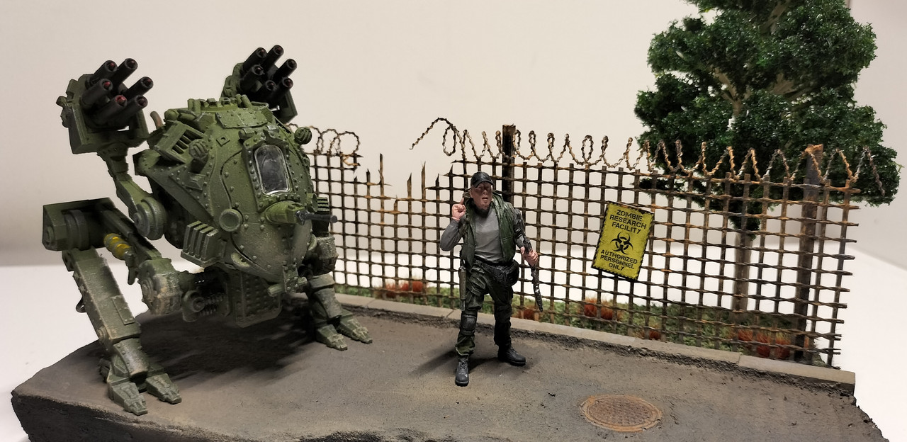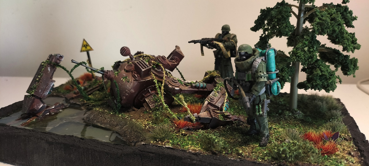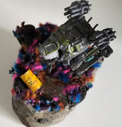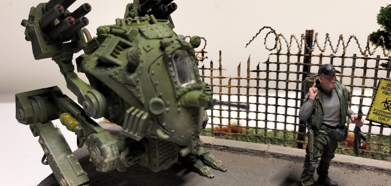 Zamisao mi je bila napraviti model sa otvorenim vratima kabine,premda je data opcija i sa zatvorenim vratima tako da sam odlučio napraviti model koji će stajati na litici nekog alien planeta(naravno onečišćen ljudskim radioaktivnim otpadom,u ovom slučaju bačvom) te su mi bile potrebne nekakve biljke i trave a izvrsnu stvar doduše za wargaming ima firma Gamersgrass.Trava se lijepi ko stick tj.odlijepiš sa folije i samo zaljepiš na željenu poziciju dok biljke su na nekakvoj foliji pa se moraju iskidat sa te folije,izmodelirat savijanjem i samo zaljepit na podlogu.