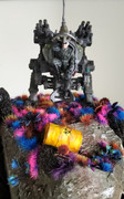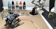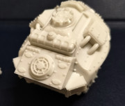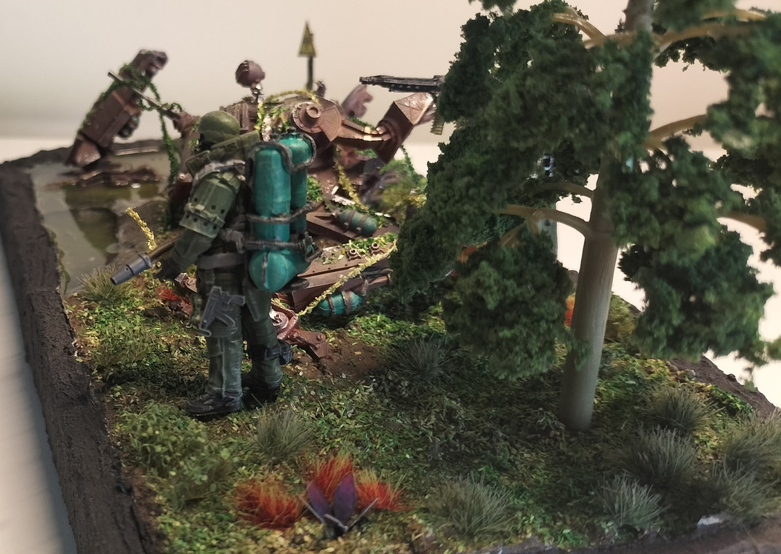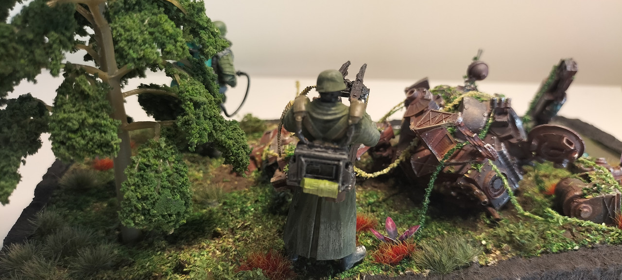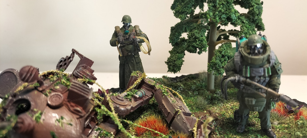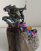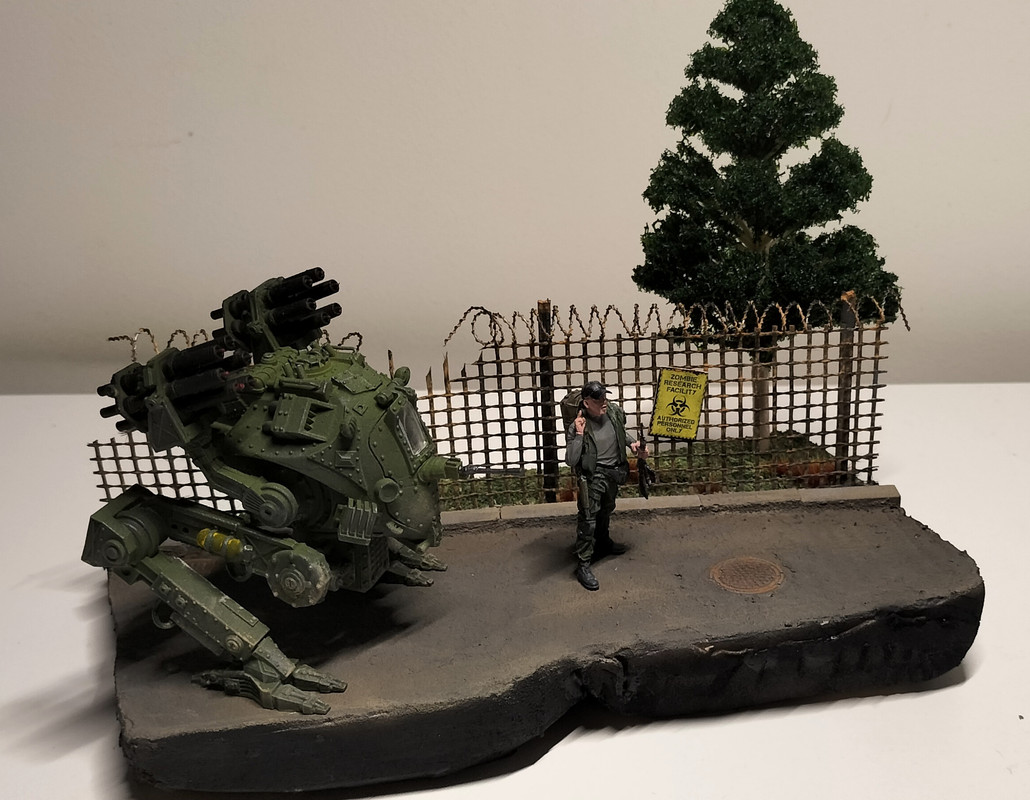 Zamisao mi je bila napraviti model sa otvorenim vratima kabine,premda je data opcija i sa zatvorenim vratima tako da sam odlučio napraviti model koji će stajati na litici nekog alien planeta(naravno onečišćen ljudskim radioaktivnim otpadom,u ovom slučaju bačvom) te su mi bile potrebne nekakve biljke i trave a izvrsnu stvar doduše za wargaming ima firma Gamersgrass.Trava se lijepi ko stick tj.odlijepiš sa folije i samo zaljepiš na željenu poziciju dok biljke su na nekakvoj foliji pa se moraju iskidat sa te folije,izmodelirat savijanjem i samo zaljepit na podlogu.