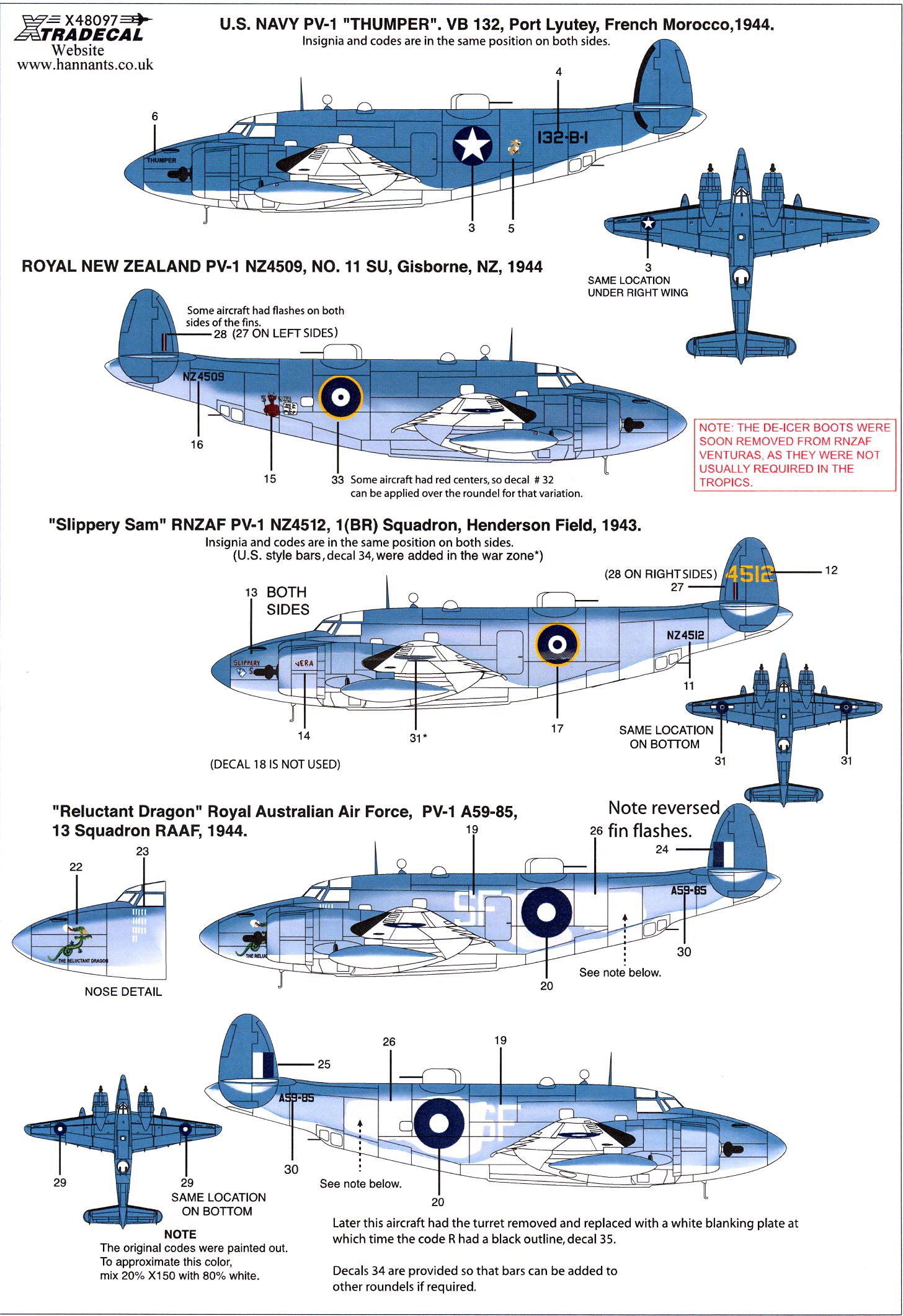 Serijski brojevi Ventura se ne vide, pa moram nagađati. Neke poznate Venture 25 Sqn 'C' su 6052, koja leti do rujna 1944., a zamjenjuje je AJ483 (ne znam da li dobiva kod 'C', a bila je prije 'D' u 27 Sqn SAAF); 6022 ima kod 'P' i neko vrijeme 'C '. 6413 je GR.V/PV-1 'C' u Južnoj Africi.