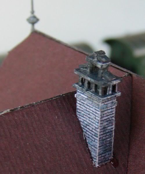 Dimnjak sam izradio od papira na koji sam ink-jet printerom isprintao ranije iskrojeni uzorak zida od cigle. Veličinu dimnjaka možete usporediti sa šibicom na koju je naslonjen.