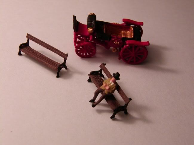 Izradio sam i klupe za čekaonu buduće stanice. Kako bi provjerio da li sam dobro odredio dimenzije klupe u 1:160, posjeo sam kočijaša iz Noch-ovog kupovnog seta u N mjerilu,