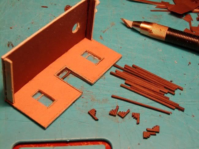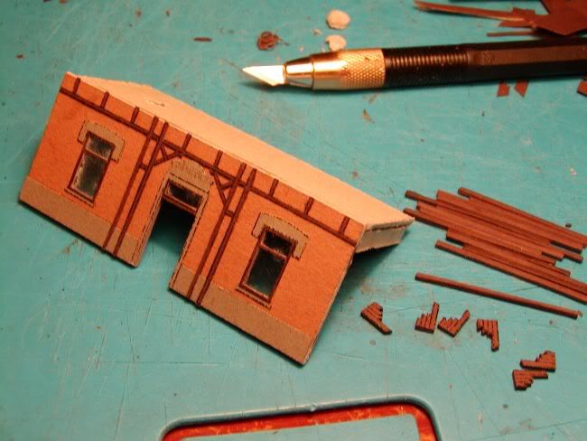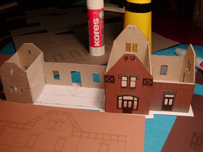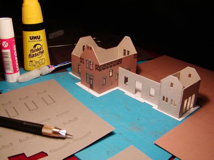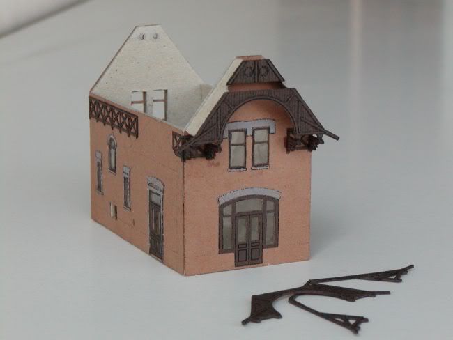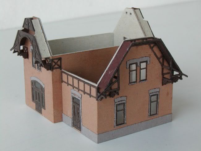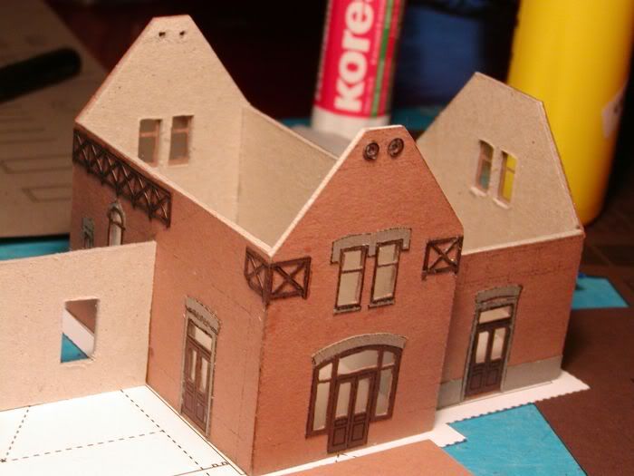 Osnovna konstrukcija sam izradio od kartona/ljepenke debljine 1mm, a na to dolazi 'fasada' koju sam izrezivao od 130-gramskog papira u boji. 'Stakla' na prozorima sam izradio običnog celofana. Koristio sam tri vrste ljepila, ljepilo za papir u stiku, UHU univerzalno ljepilo, to je ljepilo poput poznatijeg Magnetina i super ljepilo u gelu, koristio sam još i Fimo masu i glinamol, a za izradu dijelova 'drvene' konstrukcije koristio sam i malo deblji papir u boji, oko 200gr. Evo kako je tekla izrada,