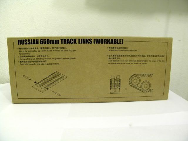 Odmah uočavamo nelogičnosti; boxart kutije krasi modernizirani IS-3 na kog ide svašta, ali ove gusjenice definitivno ne. Nigdje ne piše ukupan broj članaka no stoji podatak da je za svaku gusjenicu potrebno spojiti 80 članaka? No na koje vozilo? Okrenimo kutiju i dočekati će nas nešto što na prvi pogled izgleda kao M-26 Pershing i njegove T-80 gusjenice? Mada kad promislim, vjerojatnije je riječ o HVSS T-66 gusjenicama za M4 "Easy Eight" koje "Trumpeter" također nudi...