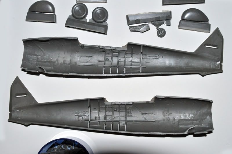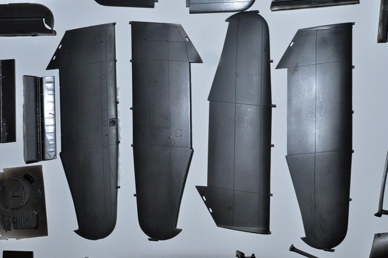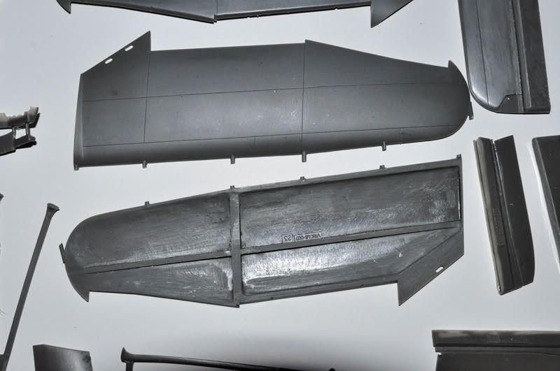 Krila se sastoje iz četiri dijela – gornjih i donjih polovica, sa odvojenim kontrolnim površinama, koje imaju zavidno tanke izlazne rubove (što je inače boljka većine maketa). Krila su zbog uštede na težini iznutra izdubljena ali sa ojačanjima, tako da su posve ravna. Upornice su vrlo tanke, i na mojem su primjerku bile prilično savijene pa će ih trebati poravnati u toploj vodi kao i neke druge dijelove. Zbog težine krila trebati će upornice pojačati metalnim umetcima, a vjerojatno ću to učiniti i sa nogama stajnog trapa.