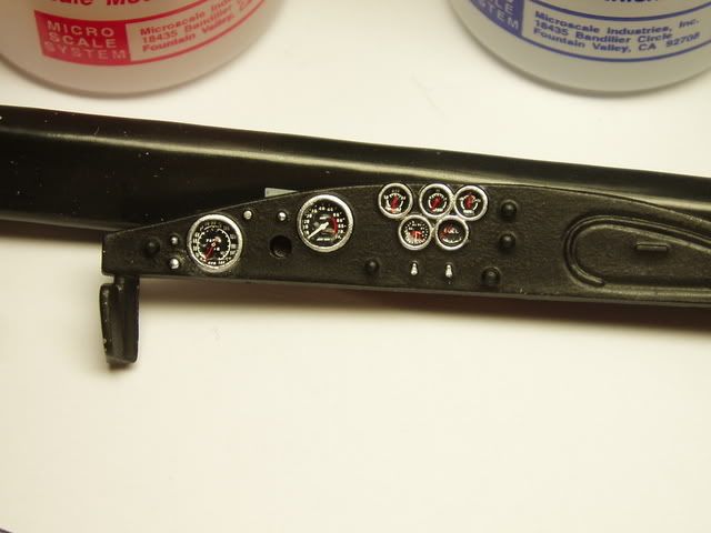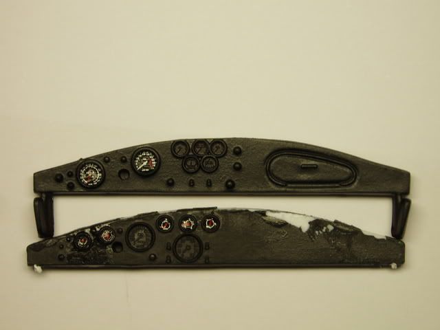 Prvo, dashboard...uspio sam sa donor kita spasiti vecinu decala cajgera...uz dosta truda i omeksivaca za decale sam sa starog dashboarda skinuo sve osim jednog malog cajgera koji je bio zaliven ljepilom...zatim sam ih pazljivo nanio na novi dash, a preostali cajger lagano drybrushao...vidi se razlika ali iz daljine uopce nije lose i prilicno sam zadovoljan dobivenim: