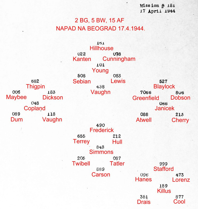 Eto i rasporeda 99th BG dan ranije, 16.april 1944. Vodeci avion 42-32065 ''El Diablo'' (ovde pogresno oznacen kao 055) je dobio direktan pogodak flaka u krilo i oboren je malo pre odbacivanja bombi. Skinut je i jedan Liberator na drugoj strani grada.