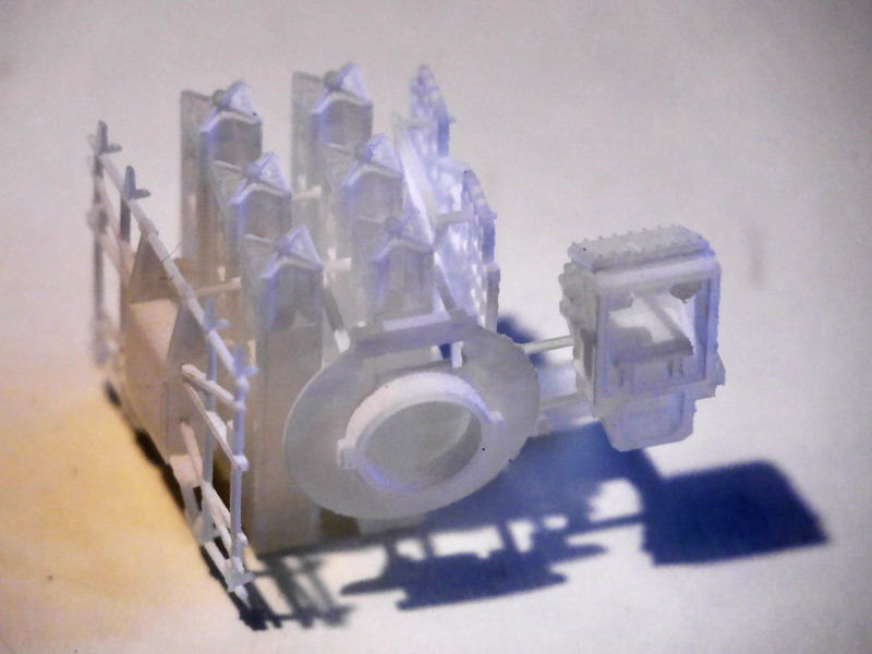 Primjer printa , na boku nadgrađa vide se crte slojeva (detalj printera 0,1 mm, kvake na vratima su 0,1 mm, okviri prozora su 0,2 mm )