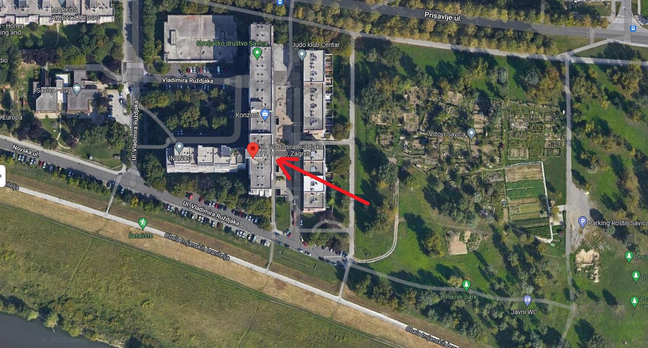 Prilažem kartu radi lakšeg snalaženja oko dolaska sutra. Ulazak je s platoa s istočne strane lijeve zgrade (označeno strelicom).