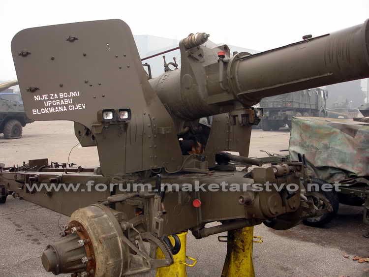 To je rumunjski T-130, u HV je nosio oznaku M-63 (nemoj pitati zasto bas M-63, to nitko ne zna). Na ovim slikama vidim da mu fale hidraulicna kocnica trzanja i povratnik cijevi, zatim plinska kocnica na ustima cijevi, ne vidim ni izravnjac, a nema ni lopata krakova. Naravno, nema ni kotaca.